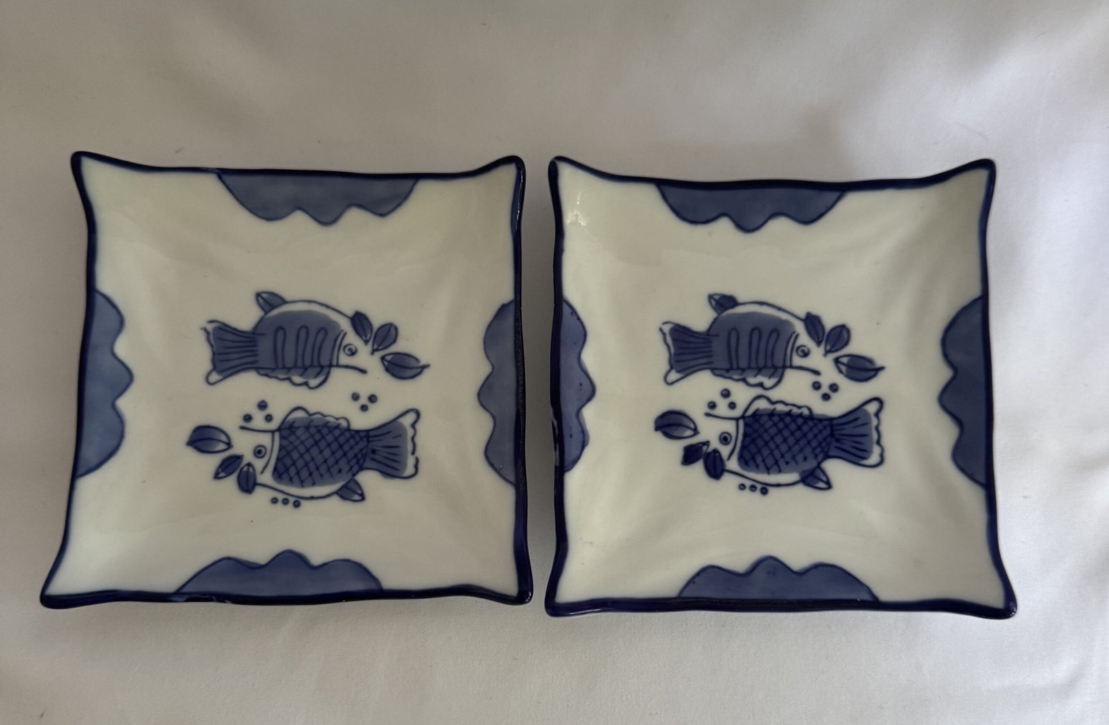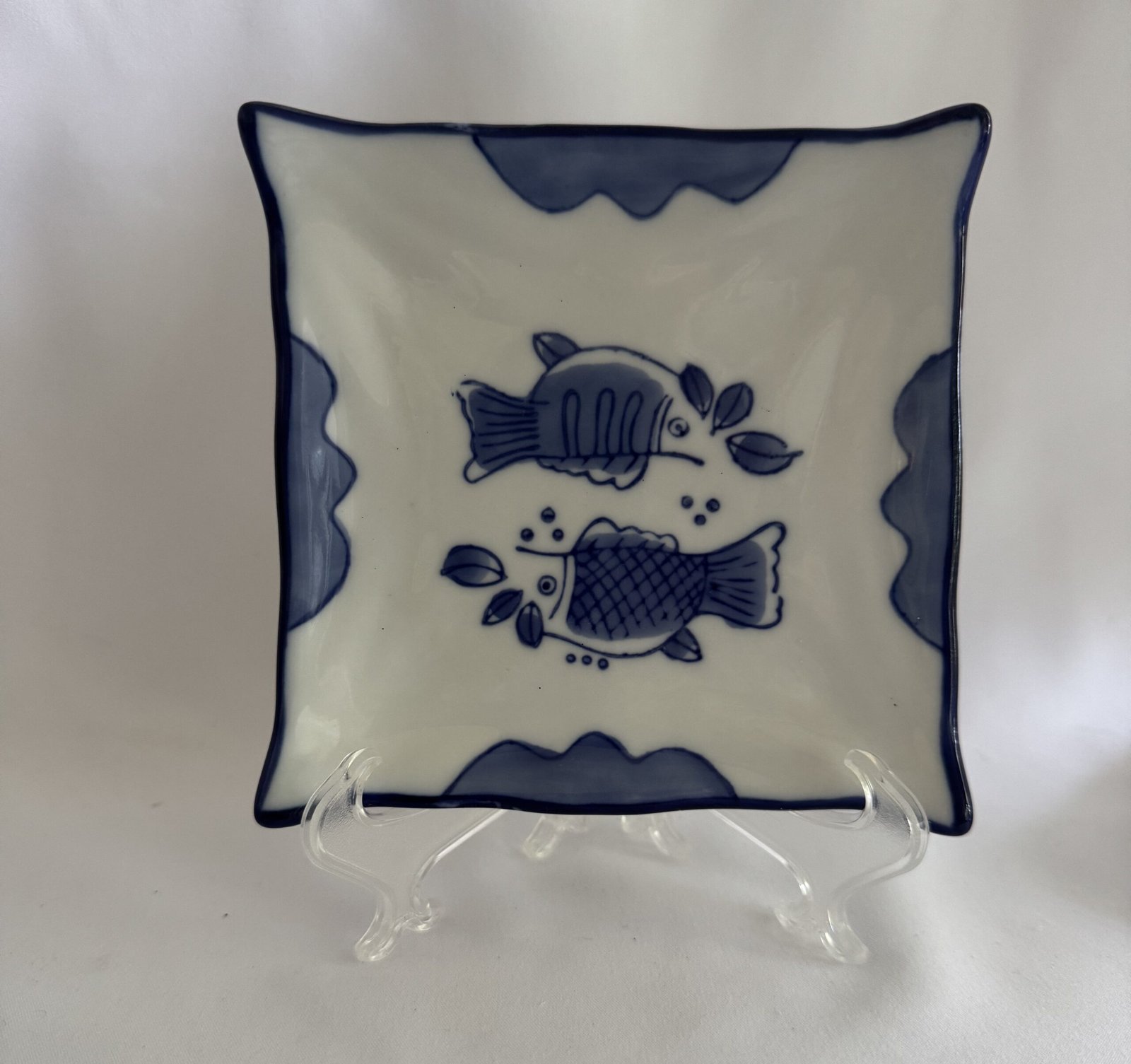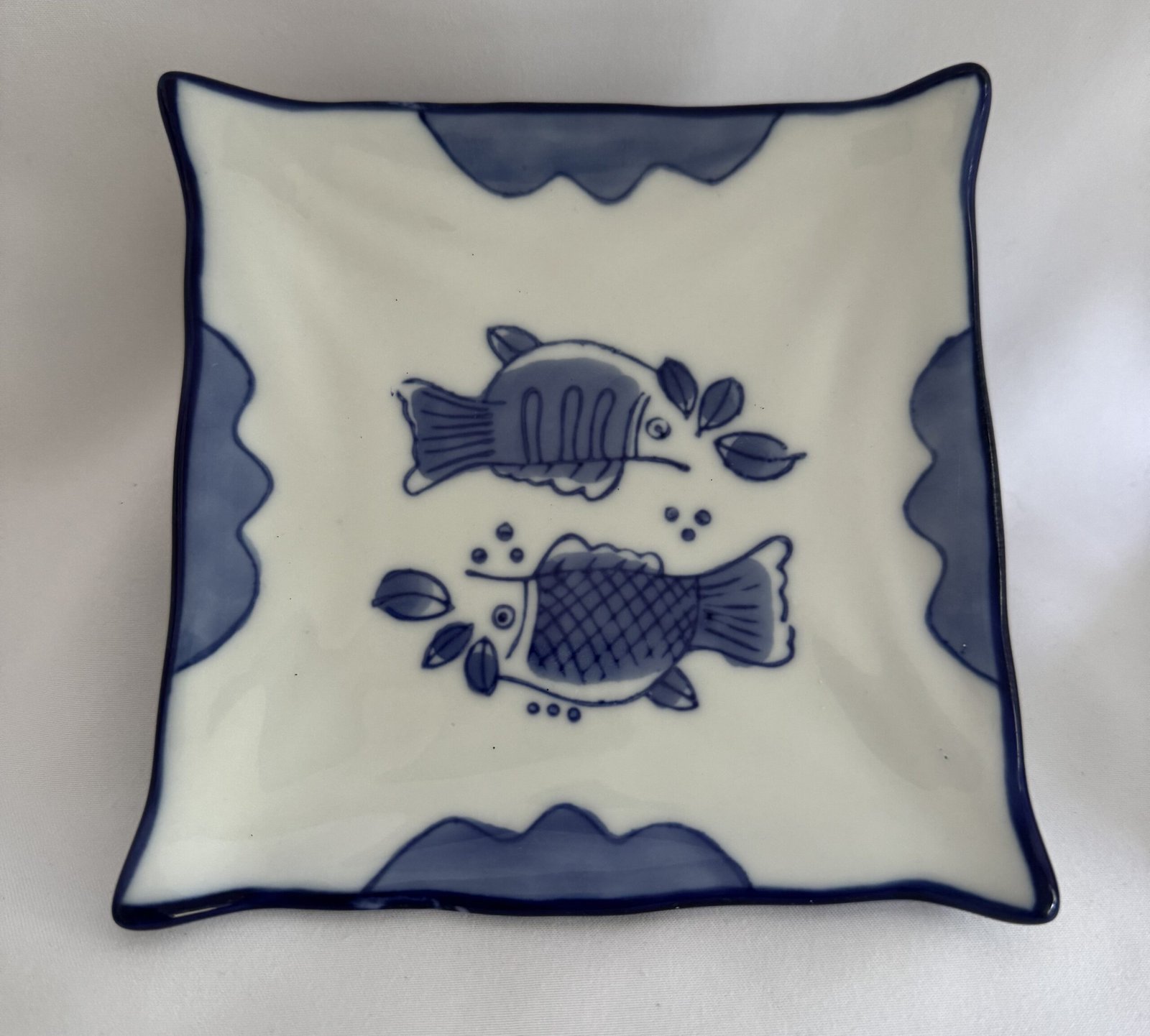 Be the first to review “Vintage Blue and white hand painted fish small square plate”